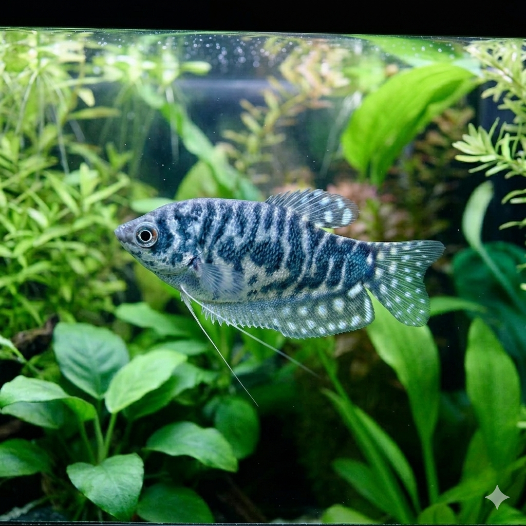 マーブルグラミー(Marble Gourami)は、スリースポットグラミーの改良品種で、大理石のような美しい模様と丈夫な体質から、古くからアクアリウムで親しまれている人気の熱帯魚です。