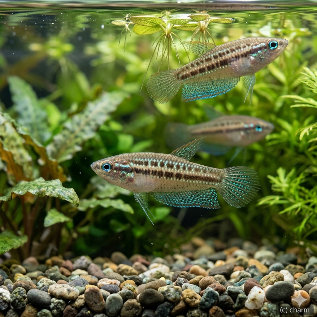 ピグミーグラミー(学名:Trichopsis pumila)は、その名の通りグラミーの中でも最小クラスの美種です。喉を鳴らして「パチパチ」と音を出すユニークな習性や、光の当たり方で虹色に輝く瞳が非常に魅力的です。